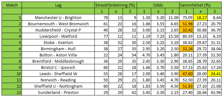 Jämfört med förra veckan är det en färglös oddsanalys. et finns inga stora värden och varken röda eller gröna färger i tabellen. Veckans mest överspelade tecken är Bournemouth, där det skiljer runt 9 procentenheter jämfört med sannolikheten enligt oddsen. Det finns en handfull andra hemmalag som också är överspelade mer än 5 procentenheter och samtliga lag markerade med orange bör undvikas den här veckan. Största värdet finns på Sheffield W, med lite över 7 procentenheters värde, och tvåan bör vara med på kupongen. Men den är knappast spikvärd och i match 10 spelar vi hellre mot Leeds och skriver x2.
