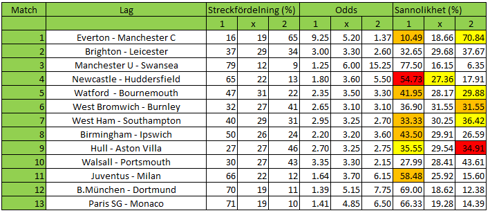 Det är inga stora värden i veckans oddsanalys och de starka färgerna uteblir, med två undantag. Newcastle och Aston Villa är båda överspelade mer än 11 procentenheter på stryktipset. Newcastle är stora favoriter, men vi lutar åt att spela mot dem och måste i alla fall ta med krysset på kupongen. När det gäller Aston Villa är det ingen tvekan att tvåan ska undvikas till varje pris, frågan är bara om man ska spela mot dem eller spika Hull? Veckans största värde finns på Man City, trots att de är storfavoriter, och där måste tvåan spikas.