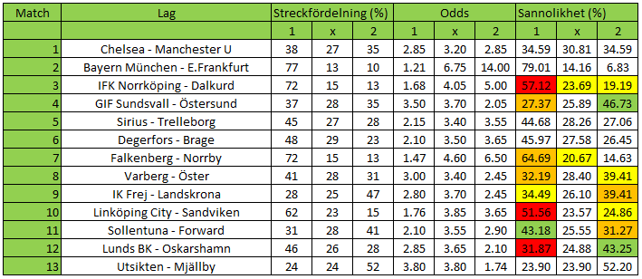 Det finns några starka färger i veckans oddsanalys, där Norrköping, Linköping och Lund sticker ut som kraftigt överspelade hemmalag. I princip är samtliga 3 lag ospelbara på stryktipset och vi har för avsikt att spela mot dem och skriva in x2 i både match 3 och 10. Match 12 har däremot så fint värde på Oskarshamn att de förtjänar att spikas. Sollentuna i match 11 och Östersund är andra lag med fina värden som gott kan spikas den här veckan. Öster och Frej har hyfsade värden och de ska helt klart spelas, men där bör man nog gardera upp med med andra tecken.
