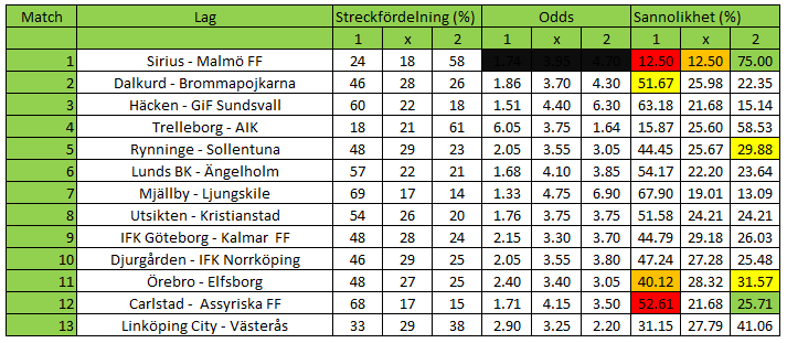 Den här veckan finns det inte mycket färg i oddsanalysen. Det störst värdet är dessutom en ren sifferexercis. Tvåan finns i 12 av de 16 bollar som används vid lottningen av match 1 och då tecknet än så länge bara spelats av drygt 58% av de inlämnade spelen så ä det bara att lita på siffrorna och spika tvåan. Den enda matchen som sticker ut i övrigt är match 12 där Carlstad är hårt överspelade och det finns ett fint värde på Assyriska, med ett hemmalag som är överspelat mer än 15 procentenheter på stryktipset undviker vi ettan och spelar x2 där. Största värdeskillnaden efter det är match 11, där Örebro är överspelade nästan 8 procentenheter och precis som match 12 spellar vi mot hemmalaget och skriver in x2.