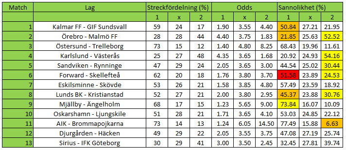Det är ont om starka färger i oddsanalysen, men det finns en del spännande, mindre, värden och en hel del spikkandidater den här veckan. Största avvikelsen i oddsanalysen är Match 7, där Forward är överspelade mer än 10 procentenheter på stryktipset. Det är tillräckligt för att undvika ettan i den matchen och istället gardera krysset och tvåan. Kalmar är överspelade lite över 8 procentenheter på hemmaplan i match 1 och även där blir det att spela mot dem och skriva in krysset och tvåan på kupongen. Största värdet återfinns på tvåan i match 2 och trots att Malmö spelat Campions League kval tvekar vi inte att spika tvåan mot Örebro. Det finns två andra favoriter med mer än 5 procentenheters värde i analysen, Västerås och Mjällby. Även dessa två lag bör spikas den här veckan.