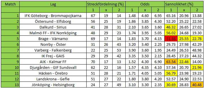 Dalkurd, Malmö FF och Häcken är de favoriter som har minst 5 procentenheters värde oh dessutom spelar samtliga 3 på hemmaplan. Alla 3 bör spikas på den här kupongen. Landskrona är en annan favorit som spelar hemma och där det finns eett visst värde, även där kommer vi att spika ettan.