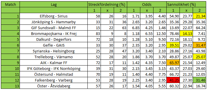 Det är en match som sticker ut när det gäller värde den här veckan, match 12. Falkenberg är överspelade nästan 12 procentenheter på stryktipset enligt oddsanalysen och det ger i sin tur Varberg ett värde på över 12 procentenheter. Med ett sådant värde så måste tvåan med på kupongen och sedan blir det smaksak om man vill spika, gardera med krysset eller ta med ettan trots att den är överspelad. AIK är överspelade runt 6 procentenheter i matchen mot Kalmar och om vilar spelare inför returmötet mot Braga i Europa League kvalet så finns det nog skäl att vara försiktig där och i alla fall ta med ett kryss på kupongen. Gefle har ett visst värde i match 6, där stryktipsspelarna har en annan favorit än oddssättarna i vad som spås bli en jämn match.