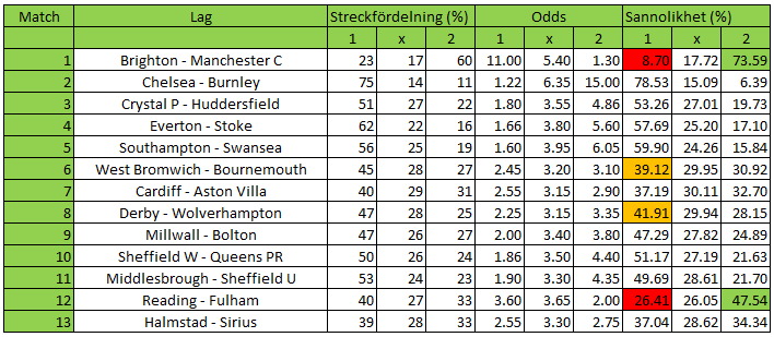 Till skillnad från förra veckan så är det mindre färger i veckans oddsanalys och det är egentligen bara två matcher som sticker ut. I match 1 finns det ett stort värde på favoriten Manchester City borta mot Brighton, där stryktipsspelarna vekrar tro på en skräll. I match 12 är det Fulham som har över 14 procentenheters värde borta mot Reading i en match är stryktipsspelarna ch oddssättarna är oense om vilket lag som är favoriter att vinna. Bortsett från dessa två matcher är det bara I match 6 och 8 det finns noterbara skillnader där hemmalagen är överspelade mer än 5 procentenheter i båda matcherna.