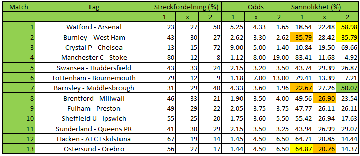När det gäller spikar den här veckan så är det lagen som redan nämnts ovan som gäller. Middlesbrough, Arsenal och Östersund är klara spikkandidater som favoriter med fint värde. Dessutom finns klara favoriter som Manchester C och Tottenham, som har visst värde. Slutligen så ser även Sheffield U ut att kunna vara en spik, de har 55% sannolikhet att vinna enligt oddsen och det finns ett minimalt värde i oddsanalysen.