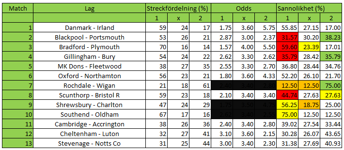 Vi inleder med en brasklapp om att vi är tveksamma till att överhuvudtaget spela på veckans kupong. Med 3 matcher som lottas och fotboll från låga divisioner blir det för mycket lotteri. Med det sagt, så finns det visst värde i just de matcher som lottas och med 75% chans på Wigan och Southend samtidigt som det finns värde i oddsanalysen så framstår båda som klara spikar. Men det är rent lotteri vilket tecken som lottas fram. I övrigt är veckans trend att hemmalagen i League 1 är överspelade på stryktipset. När det gäller Blackpool, Gillingham och Scunthorp är de dessutom ordentligt överspelade sett till sannolikheten att de vinner enligt oddsen. I samtliga dessa matcher lockar det att spela mt dem och skriva in x2. Även Bradford är överspelade mer än 10 procentenheter, men där är mesta värdet på krysset och där blir det nog ettan som spelas tillsammans med värdegarderingen på kryss.