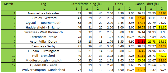 Det är mycket orange färg i veckans oddsanalys. Det är 10 matcher på kupongen där ett lag är överspelat mer än 5 procentenheter på stryktipset, men endast en av dessa är överspelade mer än 10 procentenheter. Det mest överspelaade laget är Aston Villa, där värdet är jämnt fördelat på kysst och tvåan. Aston Villa är dock så hårt överspelade att vi spelar mot dem och skriver i x2 på kupongen. När det gäller bra värden i övrigt så är Bentford och Middlesbrough två lag som är favoriter enligt oddssättarna och som har ett fint värde i oddsanlysen.