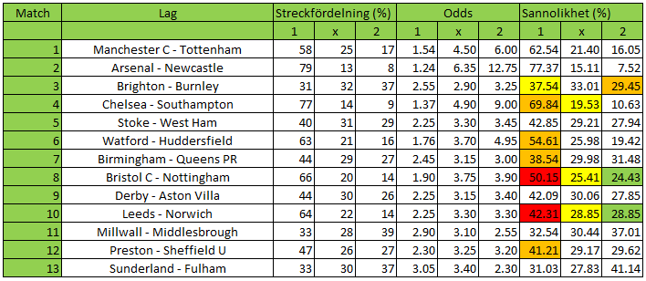 Oddsanalysen den här veckan ger en hel del färg i tabellen. Det som sticker ut mest är match 8 oh 10 där hemmalagen i bådamatcherna är kraftigt överspelade och bortalagen har ett fint värde. Leeds är värst i klassen, då de är överspelade nästan 22 procentenheter på stryktipset och Norwich har nästan 15 procentenheters värde. Här kan vi inte se något annat än att spela mot Leeds och skriva in x2 på match 10. Bristol C är nästan lika illa när de är överspelade runt 16 procentenheter och Nottingham har 10 procentenheters värde. Även match 8 känns som en match där det ska spelas mot favoriten genom x2 gardering på kupongen. Chelsea och Watford är andra favoriter som är överspelade, men det kan vara svårt att utelämna dem och bör främst föranleda att man garderar upp krysset i de matcherna.