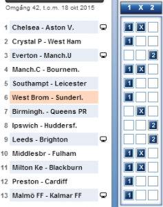 1,33 – 5,50 – 8,50. 71,52% – 17,29% – 11,19% mot 73% – 15% – 12% på de kuponger som lämnats in. Chelsea är tillsammans med Manchester City de största favoriterna på kupongen och det går inte att komma ifrån att spela på Chelsea, men de är något överspelade och ett litet värde på krysset för att det slinker med och vi hoppas på en skräll för att öka värdet på raden.