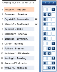 Kupongen börjar med en match som oddsen säger ska vara jämn, stryktipsspelarna håller inte med utan hr utsett Aston Villa till tydliga favoriter. Värdet finns på Watfords sida i den här matchen och vi börjar raden med en tvåa i utgångsraden.