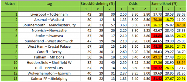 Inget grönt den här veckan, även om Manchester City är nära. Men det är gott om rött och andra fäger. Stoke, Hull, Kalmar och Arsenal är runt 10 procentenheter överspelade och West Ham är nästan 20 procentenheter överspelade. Flera av dem kräver värdegarderingar från andra tecken, eller till och med att helt spela mot favoriterna.