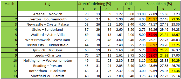 Vi har möblerat om lite, så info om inlägget och hur informationen presenteras finns nu i vår spelskola. Vi går istället direkt på oddsanalysen och spelförslaget för stryktipskupongen vecka 17. På veckans kupong har vi hela 6 matcher från Premier League och resterande 7 matcher från Championship.