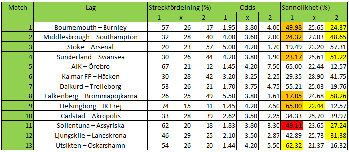 Den här veckan har vi 8 matcher där tecken överspelats eller ger oss ett värde högre än 5 procentenheter. Som vanligt är det hemmalagen som överstreckas i högst utsträckning och värde i ett antal bortalag. Sollentuna är enda lag som överstreckats mer än 10 procentenheter. Vi tycker det är lite anmärkningsvärt att tabelljumbon Sunderland får förtroende mot ett Swansea som krigar för kontraktet och att vi får ett fint spelvärde på Utsikten i match 13.