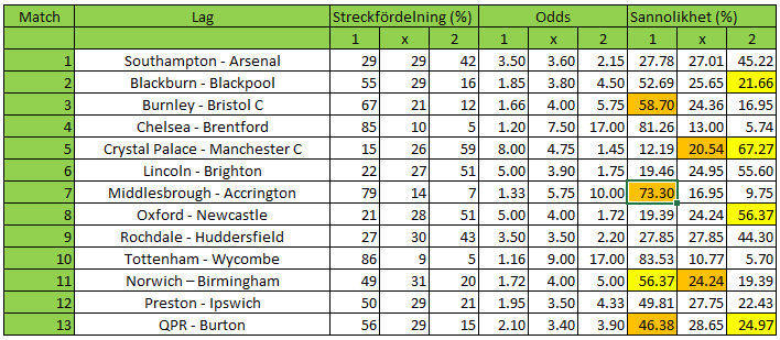 Den här veckan saknar starka färger i tabellen, inget tecken skiljer mer än 10 procentenheter mellan streckfördelningen och sannolikheten enligt oddsen. Det erbjuds dock för tillfället spännande värden på flera favoriter så det finns gott om kandidater för spikar den här veckan. Arsenal, Man City, Brighton, Newcastle och Norwich är alla favoriter med hyfsat värde och dessutom är Chelsea och Tottenham klara spikkandidater även om de är något överspelade.