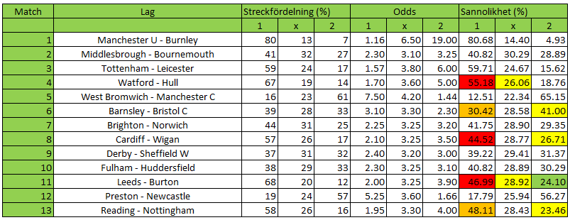 Manchsterlagen är de stora favoriterna på veckans kupong enligt oddssättarna och stryktipsspelarna håller i princip med om värderingen, även om ett litet värde finns på Man City just nu. Det intressanta den här veckan är de röda matcherna, match 4, 8 och 11. Samtliga dessa matcher har ett hemmalag där streckfördelningen ligger mer än 10 procentenheter över sannolikheten enligt oddsen.  Det är matcher där man kan få fint värde på garderingr, eller att helt spela mot favoriten. I match 11 blir det nästan automatiskt spel mot Leeds, då det skiljer mer än 20 procentenheter och  det enligt oddsen är mindre än 50% sannolikhet att de vinner. Match 6 bör man även kolla på en extra gång, hemmalaget Barnsley ligger nästan 10 procentenheter över sannoliheten och stryktipsspelarna har en annan favorit i matchen än oddssättarna.