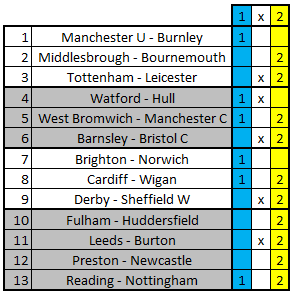 Förra veckan fick vi med garderingen på Middlesbrough borta mot Arsenal och vi skulle gärna få till något liknande här för att vara med om de stora pengarna. Som förutsättningarna ser ut blir det dock omöjligt och Manchester United spikas. Man har defensiva bekymmer med både Bailly och Smalling borta enligt Mourinhos egen utsago. Positivt för laget är ändå att man nollade och slog ut Manchester City ur ligacupen under veckan, med Rojo och Blind som mittlås. Kanske ett fall framåt med tanke på hur försvaret stundvis såg ut mot Chelsea. Juan Mata spelade antagligen till sig en startplats här tack vare matchens enda mål. Vi tror Zlatan är revanchsugen och tystar kritikerna på nytt. Burnley har inte varit ofarliga under säsongen med vinster både mot Liverpool och Everton. Båda dessa kom på hemmaplan och borta har man faktiskt inte tagit en enda poäng och bara gjort 1 mål. Man slogs dessutom ut och nollades av Accrington Stanley i ligacupen. Liksom mot Everton saknar man skadade prestigevärvningen Defour som hunnit med 1 mål och 3 assist.