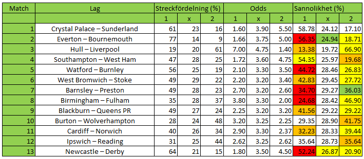 Till skillnad från förra veckans kupong finns det den här veckan en hel del att tänka över innan man sätter sina streck. Everton, Watford, Barnsley, Birmingham och Newcastle är alla hemmalag som överstreckats med mer än 10 procentenheter. Det är ett av flera argument till varför man bör undvika dessa helt och hållet, eller åtminstone gardera i den mån det är möjligt. Vi hittar fina värden i flera fina singeltvåor.