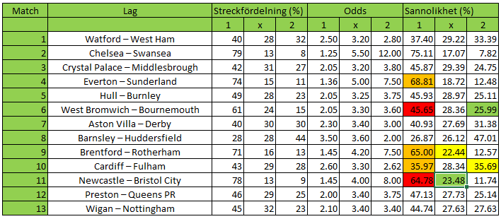 Veckans rad är inte så märkvärdig när det kommer till den tidiga oddsanalysen. Det som sticker ut allra mest är att West Bromwich och Newcastle båda överstreckats rejält. Att Newcastle blir det som 65-procentig favorit på hemmaplan är kanske inte så konstigt. Att West Bromwich anses vara 45-procentig favorit av oddssättarna och redan överstreckats till 61% är desto mer anmärkningsvärt, även om Bournemouth är inne i en svag period. Utöver dessa två matcher är Everton, Brentford och Cardiff alla något överstreckade på hemmaplan. Gardera upp vad ni har råd med. Det finns bara en bortafavorit på kupongen den här veckan, så vi är bortskämda med potentiella spikar på hemmaplan.